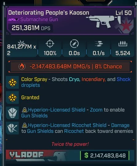 - Elemental Damage: -2,147,483,648M DMG/s with 8% Chance